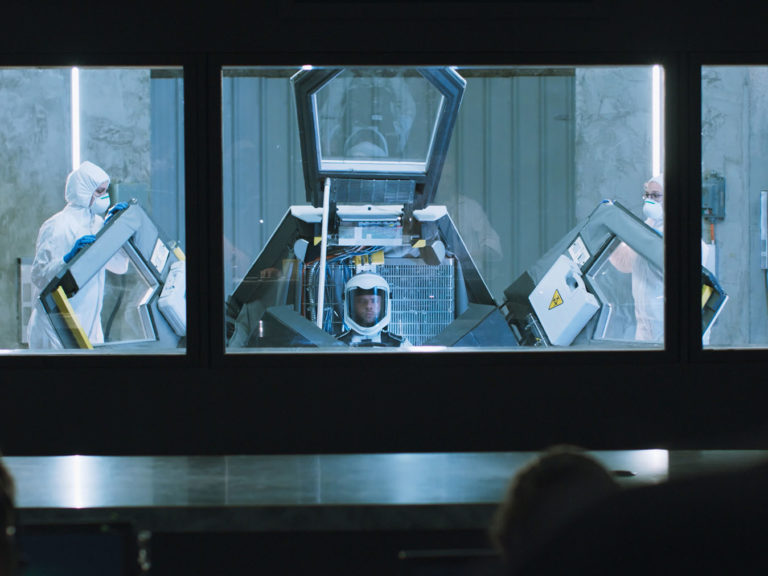 Producers Chris Beauchamp and Gordie Haakstad wanted to develop a film that was grounded in science and technology yet had the cinematic flair that sci-fi drama offers. “The design was achieved with a question always in mind: “how would this actually happen?” said Beauchamp. “Within this beautifully created set, we had the freedom to explore the wonderful emotions being delivered by our actors.”
